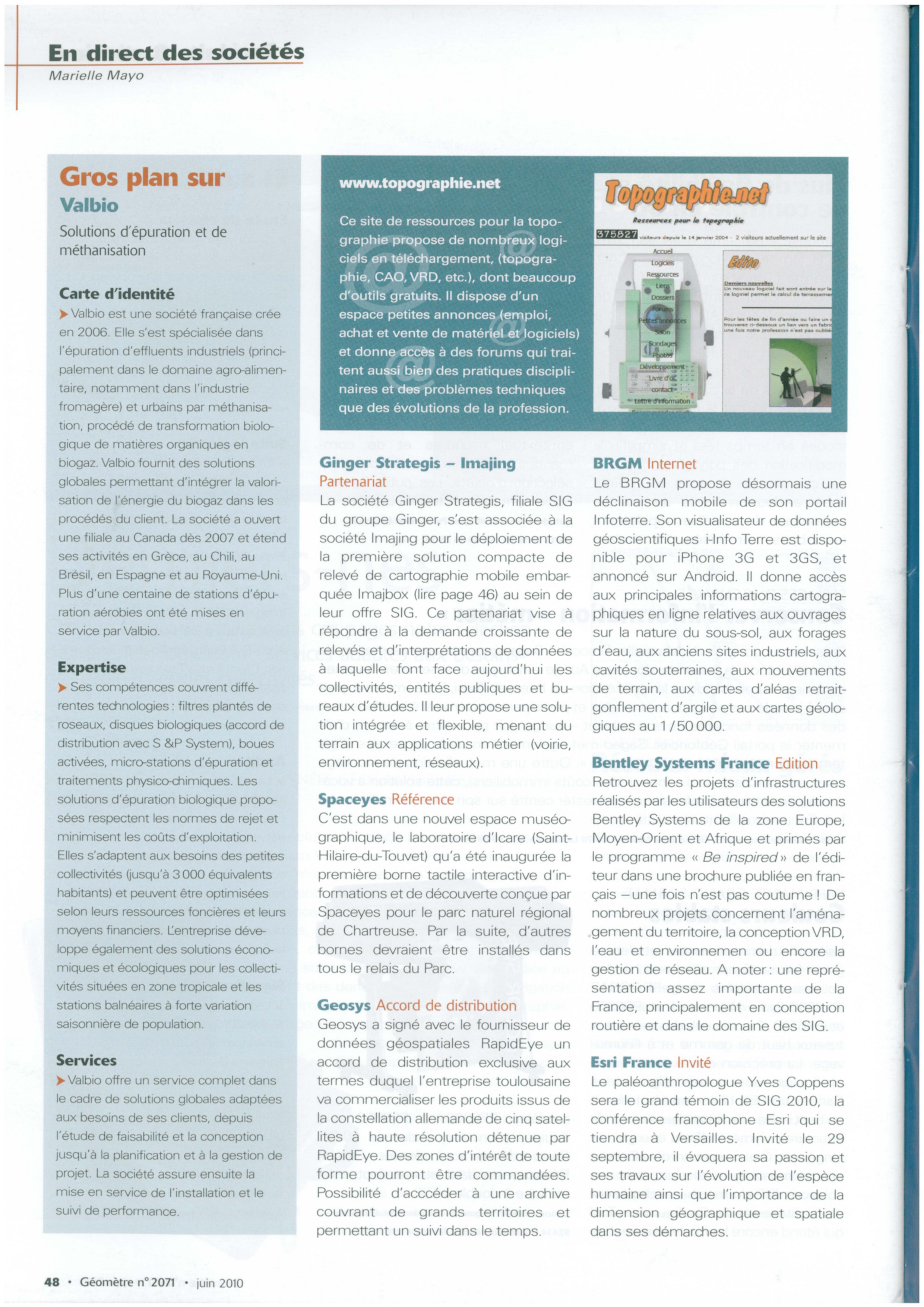 Juillet 2010 - Topographie.net dans le mensuel de juin du "Géomètre"
